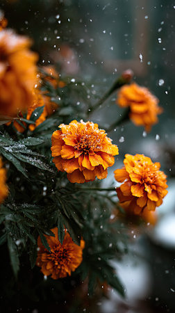 First snow falling gently on Marigold, a few snowflakes drifting slowly and settling on the leaves; fresh air, natural.