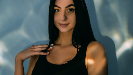A young woman with flowing dark hair poses with a soft expression. She showcases a natural look, emphasizing confidence and beauty in a simple setting with a light backdrop.