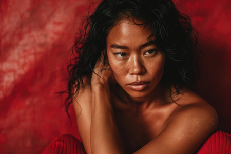This stunning close-up features a young Asian woman with long, wavy dark hair, gently touching her face. Her soft expression and natural beauty radiate warmth and confidence, inviting viewers to connect with her serene presence.