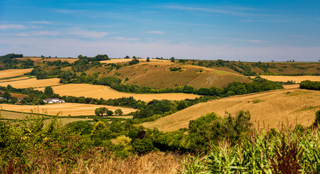 Beautiful late Summer afternoon light over rolling hills in English countryside landscape with vibrant warm light