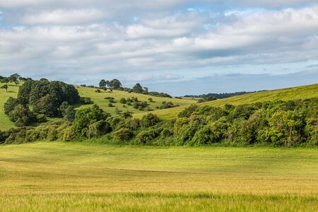 Summer green landscape in British countryside. A vibrant summer landscape in England. Lush green fields of barley growing in the English countryside. Farmland View, UK.