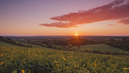 Beautiful Summer sunset from Firle Beacon in South Downs National Park in beautiful English countryside