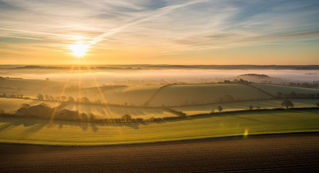 A sunrise paints the sky with warm golden hues, casting long sunbeams that cut through a gentle layer of mist blanketing the rolling hills. Lush green fields and cultivated land are illuminated, creating a serene and tranquil pastoral scene. The soft light and atmospheric haze evoke a sense of peace and natural beauty in the countryside.
