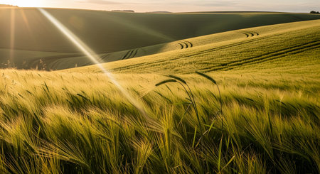 Sun rays flare dramatically over a rolling field of golden wheat or barley, highlighting the texture of the grain heads in the foreground. The warm, golden hour light bathes the agricultural landscape in a peaceful and bountiful glow, signaling harvest time.