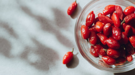 A vibrant display of fresh red goji berries in a glass bowl showcases healthy organic ingredients. Shadows create a dynamic contrast against a light gray background.