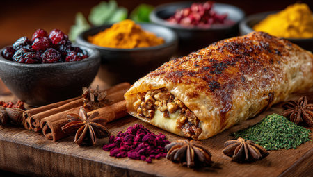Baked pastry filled with savory meat and spices, surrounded by vibrant spices and dried fruits on a wooden table, highlighting the beauty of culinary presentation