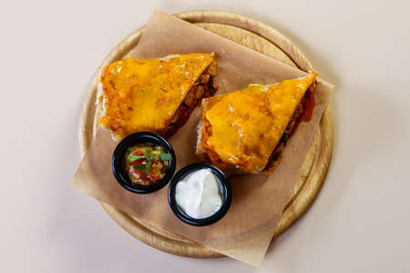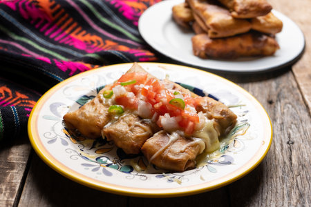 Traditional mexican chimichanga with melted cheese and pico de gallo sauce on wooden background
