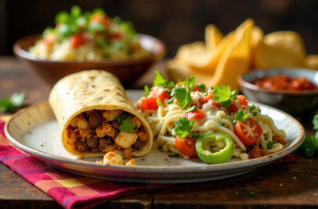 Delicious mexican cuisine featuring burrito and nachos with fresh vegetables.