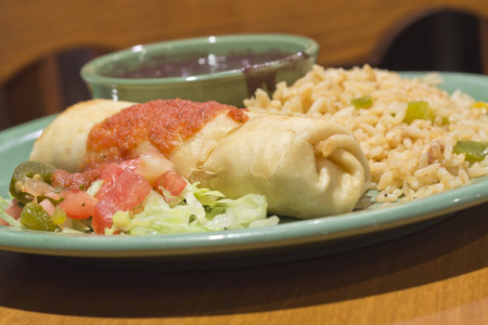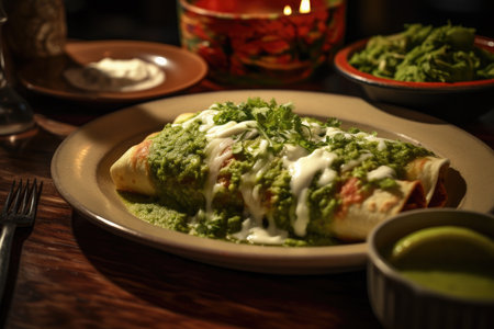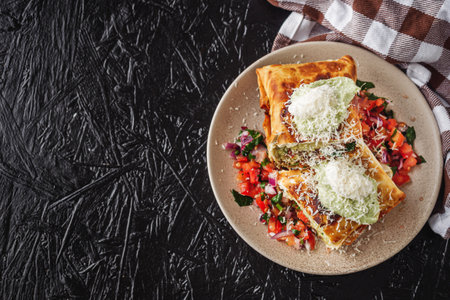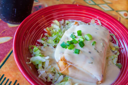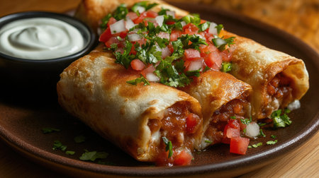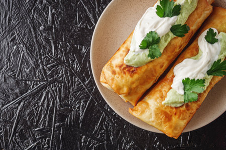 Authentic Mexican chimichanga burrito with sour cream jalapeno and cilantro