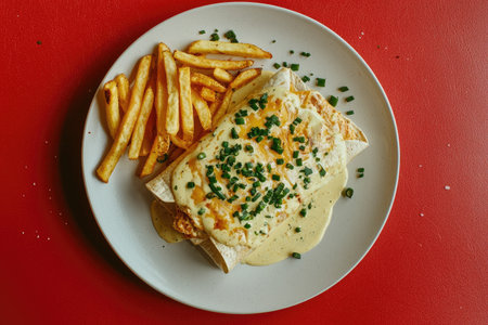 Photo of an enchilada with chicken and cheese on top, centered on a white plate, against a red background, with green onions and drizzled with chili sauce, served with a side of French fries. Food photography, delicious, high resolution, high quality, professional photograph, very detailed. --chaos 30 --ar 3:2 --quality 2 --stylize 250 --v 6.1 Job ID: 84ec6713-f1ad-4932-aa81-33e24e3f5012