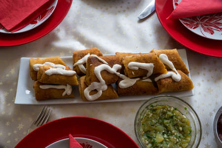 chicken flautas accompanied by cheese cream and guacamole presented at a traditional mexican restaurant