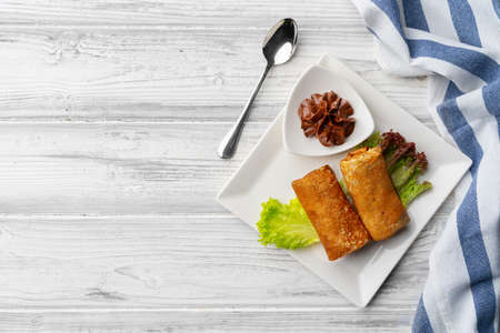 Lumpia on a white plate with chili sauce and chili sauce. Lumpia is a typical food from Indonesia.