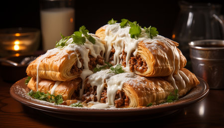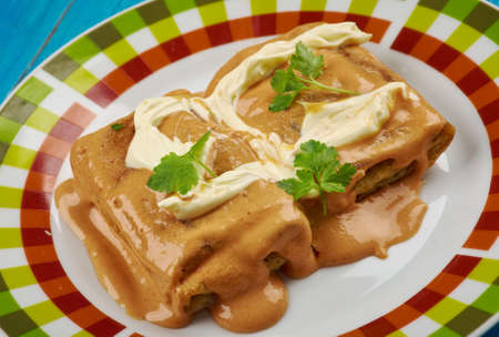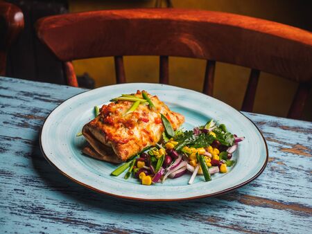enchiladas stuffed with vegetables and meat with melted mayonnaise on a wooden table