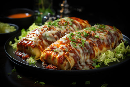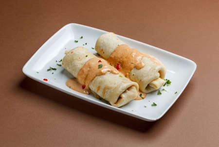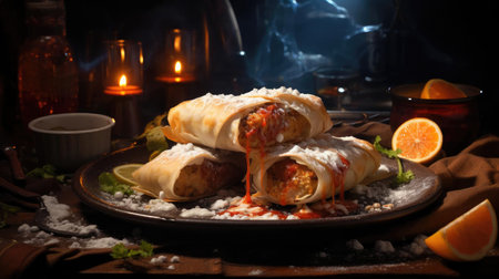 Illustration of a plate of burritos, prepared in the typical style of Mexican cuisine.