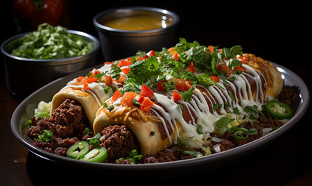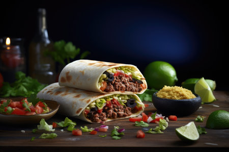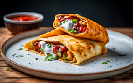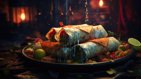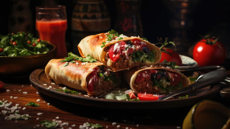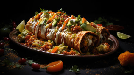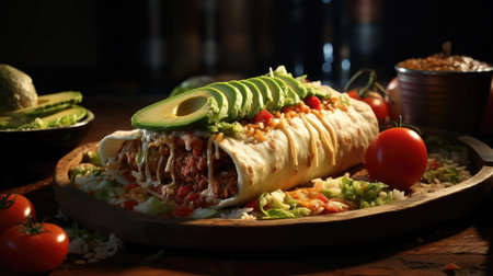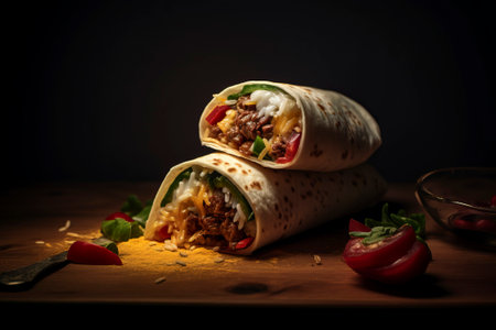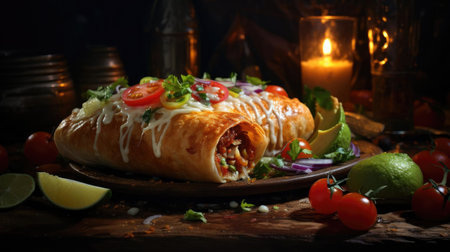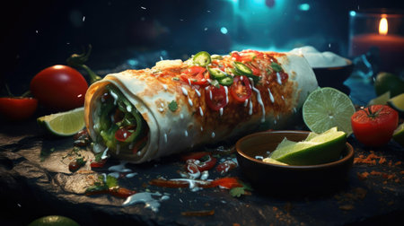 Generative AI illustration of typical Mexican burrito with meat, vegetables, sauces and spices. Typical Mexican food
