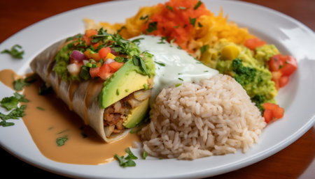 Tasty Mexican burrito with guacamole, sour cream, and fresh cilantro on a wooden background, perfect for food and restaurant concepts.