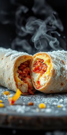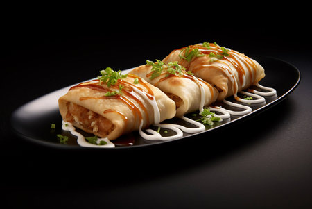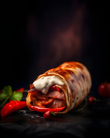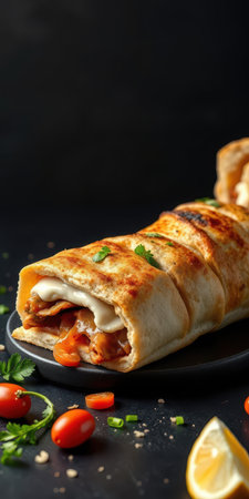 Delicious burrito filled with grilled chicken, creamy sauce, and fresh vegetables on a dark background