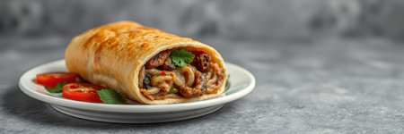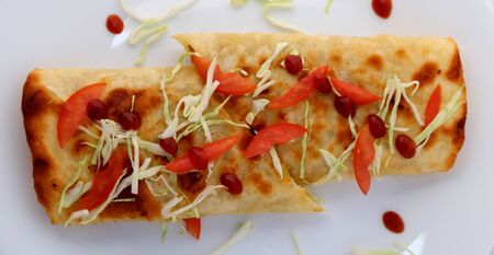 Delicious rolled flatbread filled with meat and vegetables served on a plate