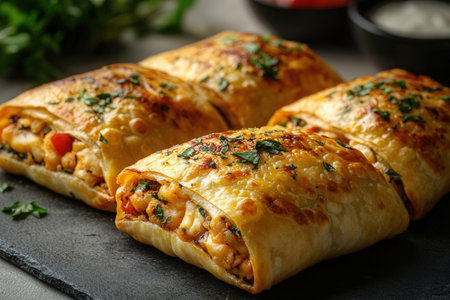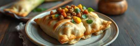 Delicious stuffed pastries served on a rustic plate with colorful vegetable filling and fresh herbs for added flavor