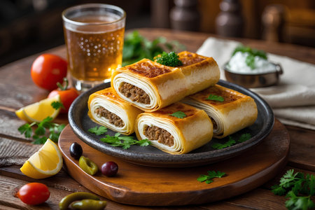 Pancakes stuffed with minced meat and cheese, served with a glass of beer