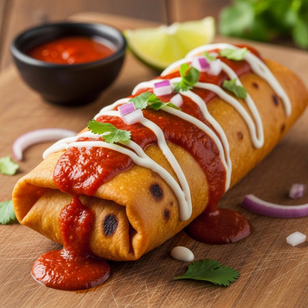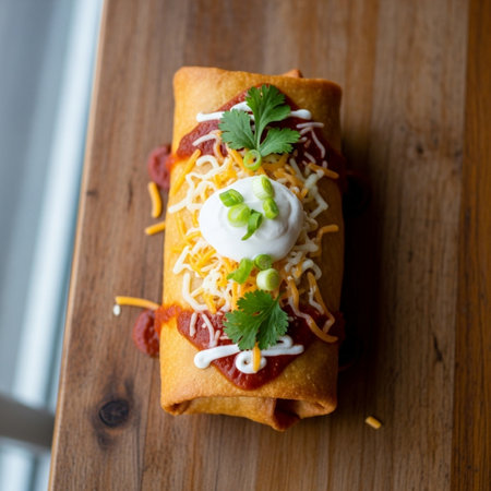 Appetizing Mexican-style chimichanga with red sauce, sour cream, and fresh cilantro on a wooden cutting board, perfect for food and restaurant concepts