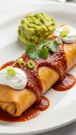 Tasty Mexican burrito with red sauce, sour cream, and guacamole on a white plate, perfect for food and restaurant concepts.