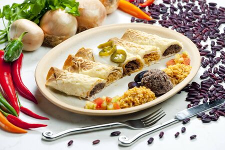 Mexican burritos with chorizo, potato, cheese and beef served with sauce barracha