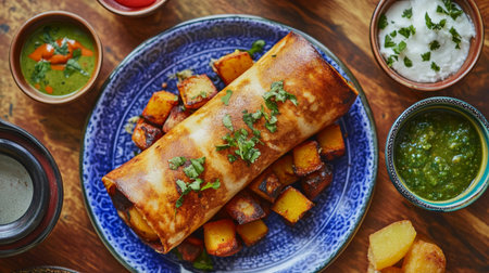 A vibrant presentation of dosa filled with spiced potatoes, served with coconut chutney and sambar in colorful bowls, highlighting the dish's textures.