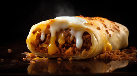 Macro shot of a cross-section of a chimichanga, revealing layers of seasoned beef, tender black beans, and melted cheese, AI Generated