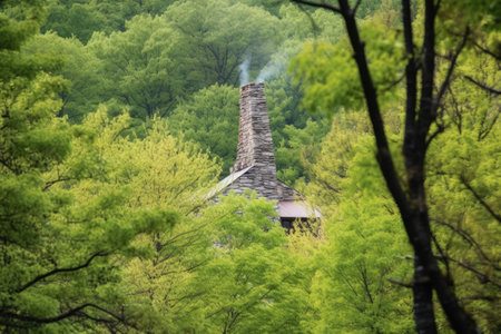 stone chimney of a secluded lodge through trees, created with generative ai