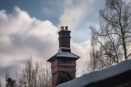 chimney stack with smoke rising from a fireplace, against the backdrop of the winter sky, created with generative ai