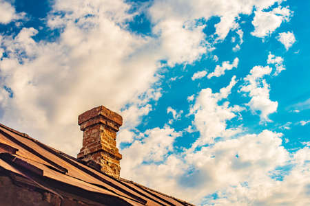 An old brick pipe on the roof of a residential building with an iron roof against a background of clouds, HDR