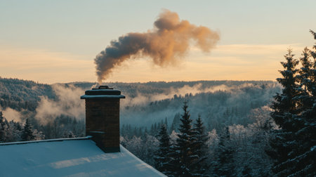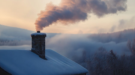 A stunning winter landscape featuring a chimney releasing smoke against a backdrop of snow-covered trees and misty hills at sunset.