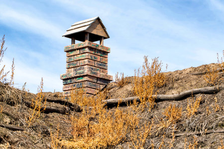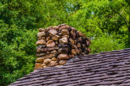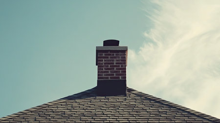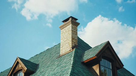 A picturesque rooftop featuring a stone chimney under a vibrant blue sky. This image captures the serene beauty and architectural details of a charming home.