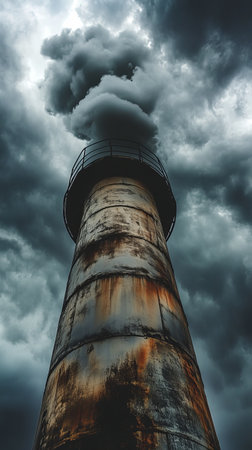 industrial smokestack against dramatic cloudy sky, pollution and environment concept