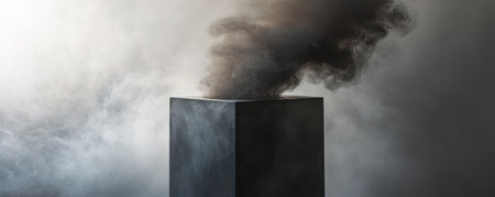 Black cube emitting dark smoke in foggy atmosphere