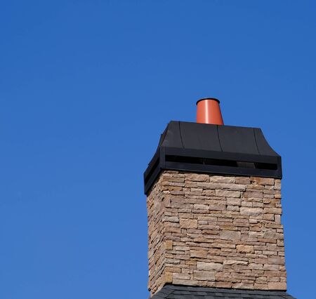 Stone Chimeny with Metal Cap Afainst a Clear Blue Sky