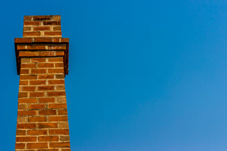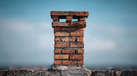 A close-up view presents a brick chimney against a soft, blurred blue sky. The chimney is constructed of reddish-brown bricks. The composition appears to be taken outdoors, bathed in natural light. Suitable for use in projects related to construction, architecture, or environmental concepts, and for a variety of commercial applications.