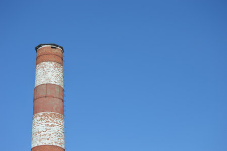 Red and white brick industrial pipe against the blue sky.
