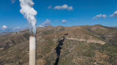 Dense smoke and steam coming out from the industrial chimney. Environmental Pollution concept.