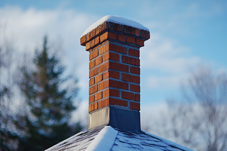 Red brick chimney rising from a snow-covered roof against a backdrop of frosty trees, embodying the essence of a cold winter day