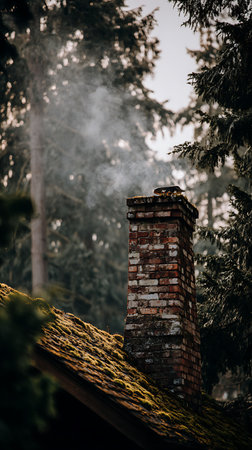 Rustic brick chimney releasing smoke, surrounded by evergreen trees. The mossy roof suggests age and nature's embrace in a serene forest clearing, peaceful and moody.