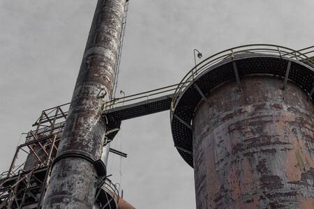 Smokestack and walkways against gray sky, industrial manufacturing architecture, horizontal aspect