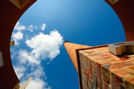 Old brick chimney. Blue sky, cloud haze