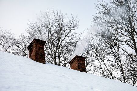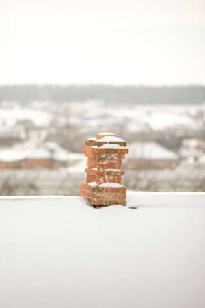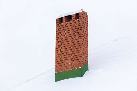 Brick chimney in the snow on the roof of the house. Winter