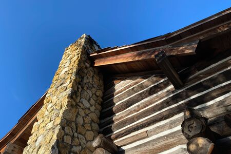 a log cabin swith tone chimney and roof line