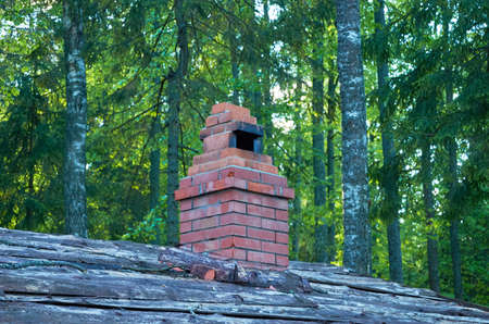The roof of a wooden dugout with a brick chimney. Forest.