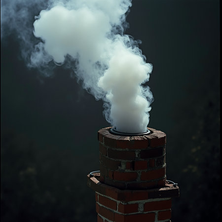 Smoke billowing from a large brick chimney in an urban neighborhood. The plume rises slowly into the cool morning air, blending with the early light.