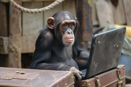 Thoughtful chimpanzee sits with an open laptop, depicting concepts of technology usage in nature