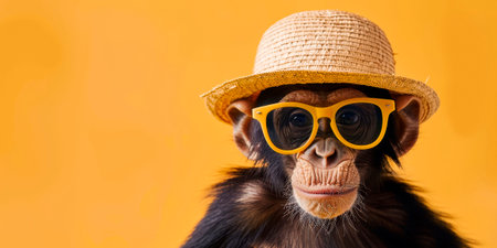 A satisfied monkey in glasses and a straw hat rests on an orange background with copyspace. High quality photo